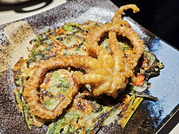 낙지 미나리전. 미나리 전 위에 호쾌하게 튀긴 낙지 한 마리를 그대로 올렸다. 먹기 좋은 크기로 자른 후 함께 먹으면 나도 모르게 막걸리를 찾게 된다. 예전에는 전에 막걸리 마시는 것을 싫어했는데 이제 나도 모르게 찾는 것을 보면 확실히 나이를 먹긴 먹었다.