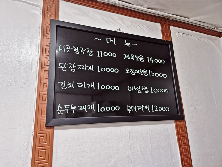 메뉴. 청국장, 된장찌개, 김치지개, 순두부찌개, 제육 볶음, 오징어 볶음, 비빔밥과 부대찌개를 판매한다. 우린 청국장 두 개, 제육 볶음과 오징어 볶음을 주문했다. 3명이 갔지만 메뉴 4개를 주문한 모범적인 고객의 모습이다.