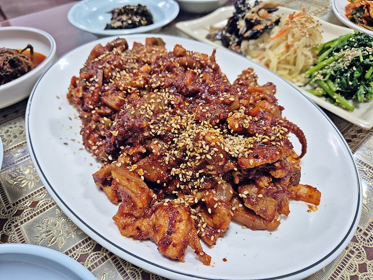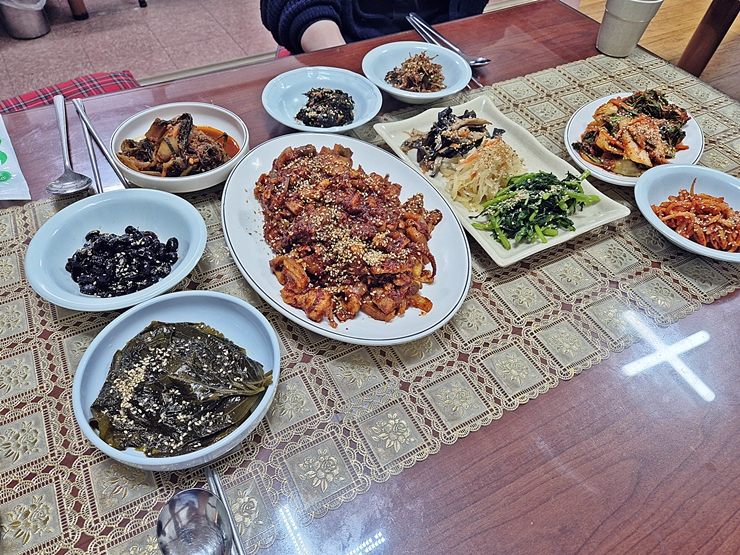 무려 10가지 반찬과 함께 나온 제육&오징어 볶음. 제육과 오징어 볶음의 소스가 같다고 하여 한 접시에 달라고 했다. 참으로 훌륭한 고객이 아닐 수 없다. 반찬은 깻잎 장아찌, 콩자반, 조림과 나물이 대부분이지만 고기를 주문했기 때문에 이런 채소 반찬도 감지덕지하다. 이런 채소 반찬 역시 참으로 훌륭한 소주 안주지.