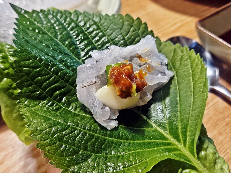 그냥 먹어도 맛있지만, 세꼬시는 이렇게 쌈으로 해서 먹으면 더욱 맛있게 먹을 수 있다. 도다리 위에 마늘, 고추와 쌈장을 올려서 먹었다. 다양한 맛이 조화를 잘 이뤄서 입 안을 행복하게 한다. 이 쌈 하나 먹은 후에 소주 한 잔 마시면 그 자리가 바로 천국이다.