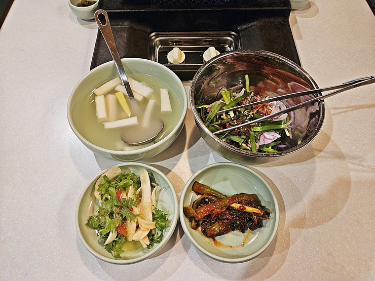 장어 전문점에서 나오는 소스, 생강 등은 사진 찍기 식상해서 다른 반찬들 사진을 찍었다. 동치미, 겉저링, 샐러드와 갓김치가 나온다. 갓김치 맛이 상당히 좋아서 그 맛을 신중히 음미하며 먹었다. 이런 갓김치 하나로 소주 한 병은 거뜬하지. 예전에는 왜 소주 안주로 김치를 먹지 생각했는데 이제는 없어서 못 먹는 안주가 되었다.