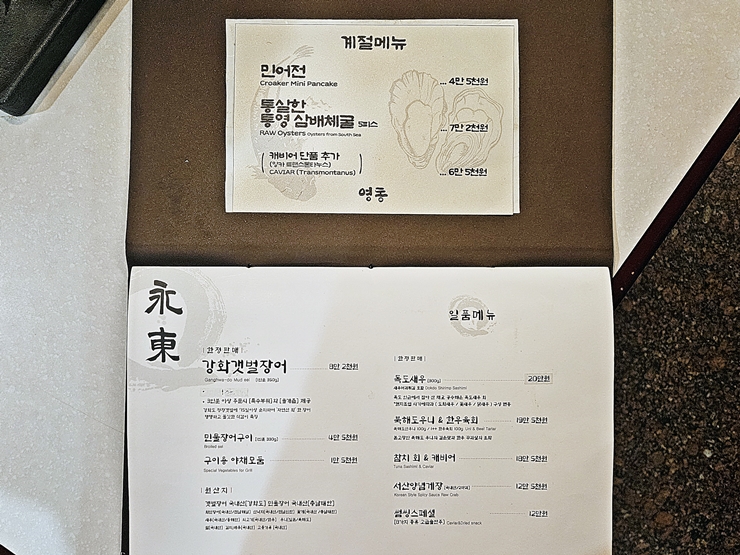 메뉴. 우리가 방문했을 때는 계절 메뉴로 민어전, 통영 굴을 판매하고 있었고, 메인 메뉴로는 강화 갯벌 장어와 민물 장어 구이를 판매한다. 그 밖에 독도새우, 우니와 한우 육회, 참치 회와 캐비어, 서산 양념게장 등도 판매하고 있다. 우리는 장어를 먹으러 왔으니 장어만 공략하기로 했다.
