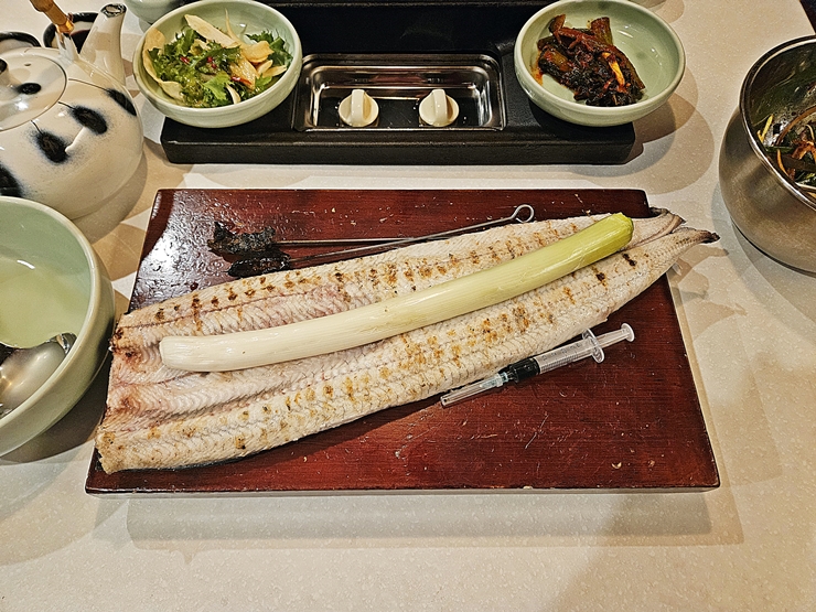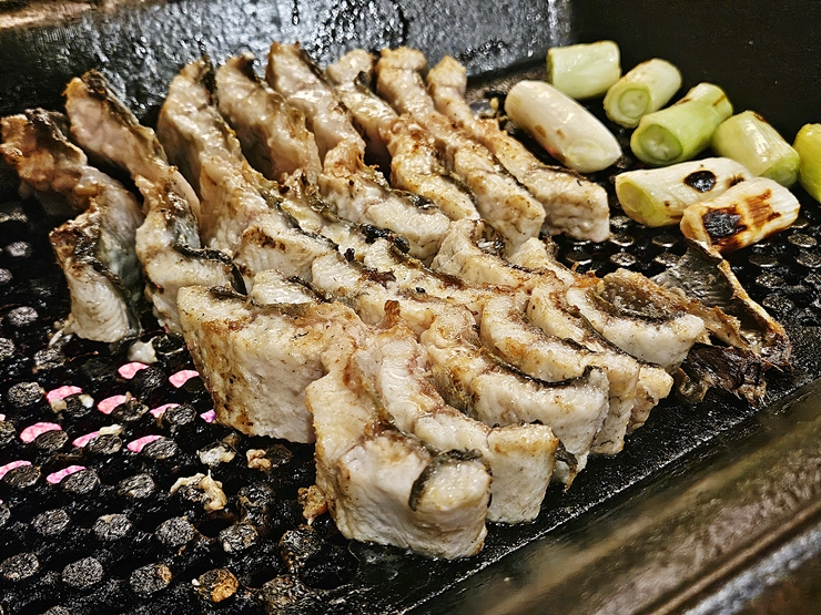잘 구워진 장어. 장어와 함께 대파도 구워주는데 이 대파와 장어의 궁합이 환상적이다. 장어는 기름기가 많은 생선이기 때문에 쉽게 물린다는 치명적인 단점이 있다. 이 장어의 느끼함을 생강이나 소스로 잡기 마련인데, 대파도 장어의 느끼함을 잘 잡아준다.