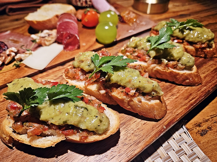 부르스케타. 바게트 위에 살사와 과카몰리를 올렸다. 바게트는 한 번 구운 것을 사용하는데 바삭한 식감이 소스의 맛과 잘 어울린다. 부르스케타는 보통 전채 요리로 먹지만 이렇게 중간에 먹어도 맛있지.