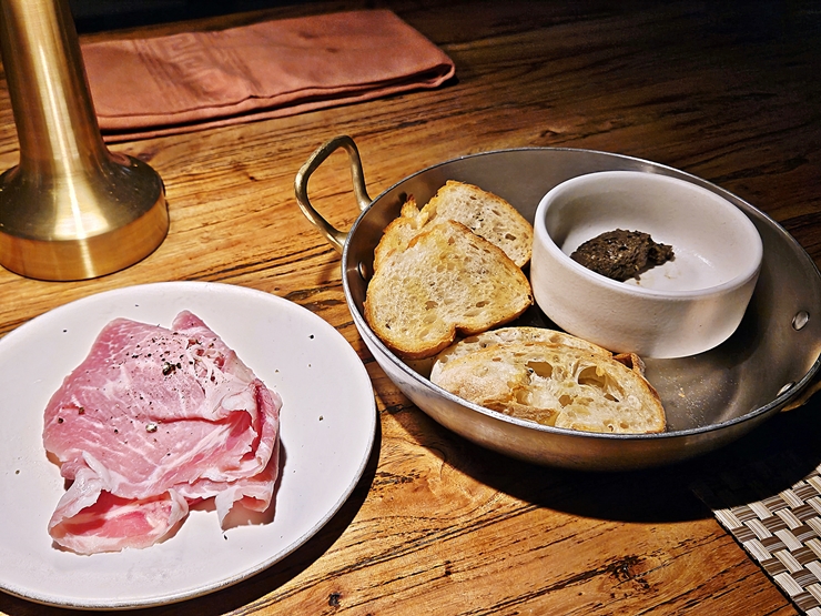 와인을 주문하면 기본으로 제공하는 잠봉과 식전 빵. 이것만 있어도 와인 하프 보틀은 충분히 마실 수 있지. 하지만 이것만 먹으면 굉장히 서운하고 섭섭하고 마음이 어두워지기 때문에 다양한 것들을 먹기로 했다.