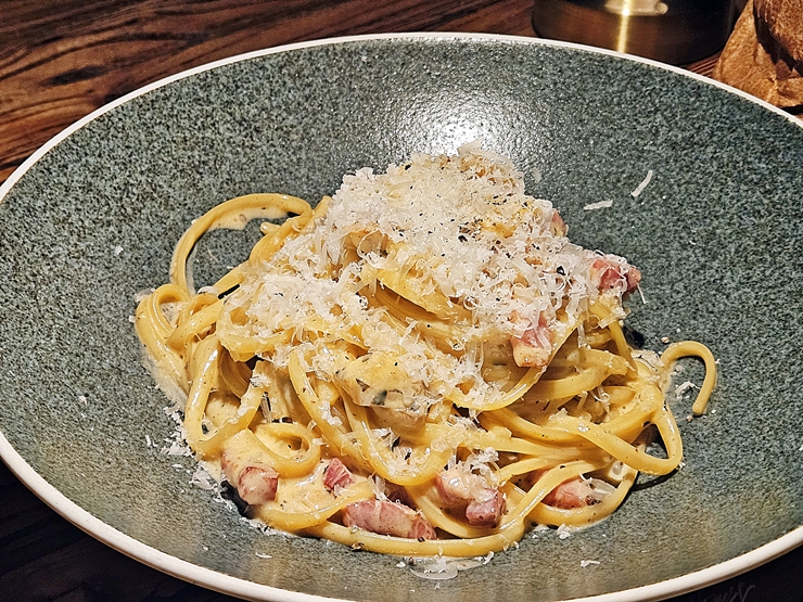 까르보나라. 두툼하게 썬 관찰레가 풍부하게 들어있다. 관찰레의 맛이 상당히 진하게 느껴져서 내 입에 참 잘 맞았다. 역시 고기가 들어가야 모든 음식이 맛있어지는 법이다.