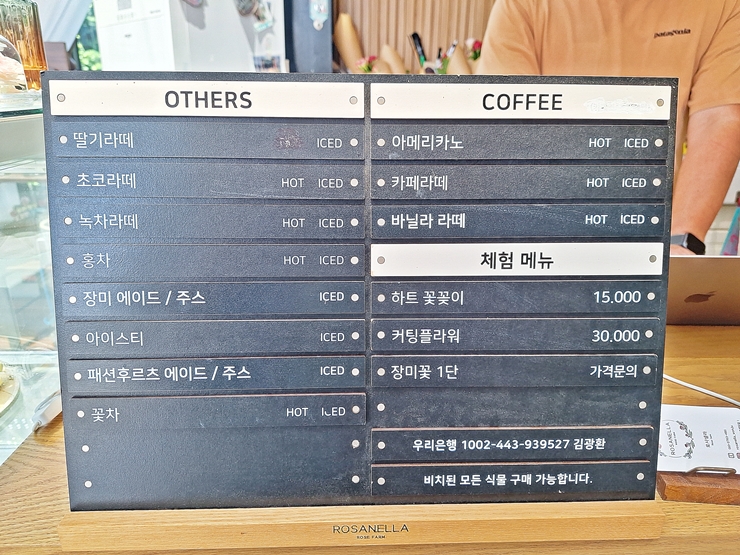 우리는 커팅 플라워로 예약을 했고 음료 값은 체험 비용에 포함 되어 있었다. 딸기라떼, 초코라떼, 홍차, 장미 에이드와 아메리카노 등 비교적 다양한 음료를 구비하고 있었다. 난 아이스 아메리카노를 주문하고 짝꿍은 장미 에이드를 주문했다.