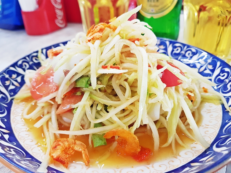 쏨땀. 파파야, 토마토, 건새우와 파가 들어있다. 지극히 쏨땀스러운 쏨땀이다. 파파야의 아삭아삭한 식감을 잘 살렸고 적당히 매콤하고 시원하다.