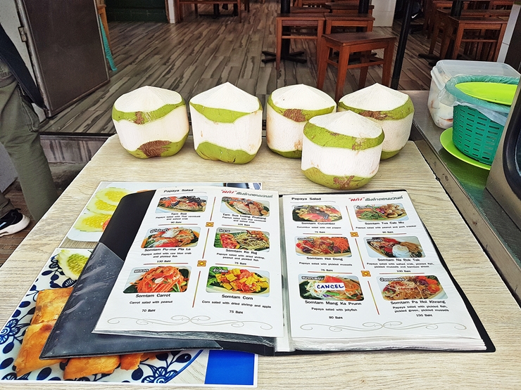 메뉴. 쏨땀을 메인으로 판매하는 곳 답게 다양한 쏨땀과 더불어 태국 음식을 판매하고 있다. 낮이기도 하고 추후 일정이 남아 있었기 때문에 쏨담, 모닝글로리 볶음과 소시지를 주문했다. 소시지는 사실 여기서 먹을 필요는 없었는데 괜히 기름진 음식이 먹고 싶어서 주문했다.