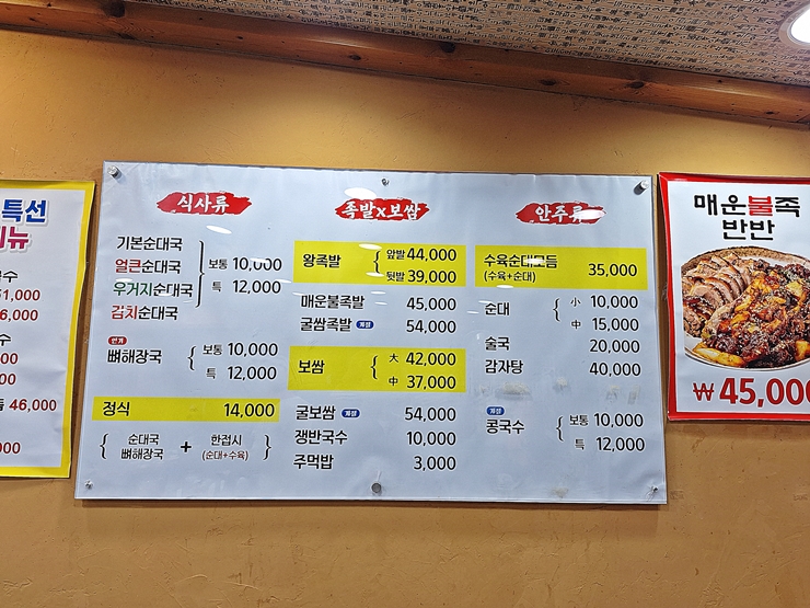 메뉴. 다양한 종류의 순댓국, 족발, 보쌈과 수육을 판매하고 있다. 우리는 비도 오고 그래서 매운 불족 반반을 주문했다. 매운 불족 반반은 불족발과 일반 족발이 함께 나오는 것이다.