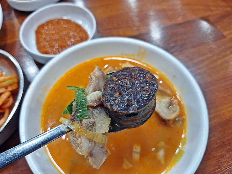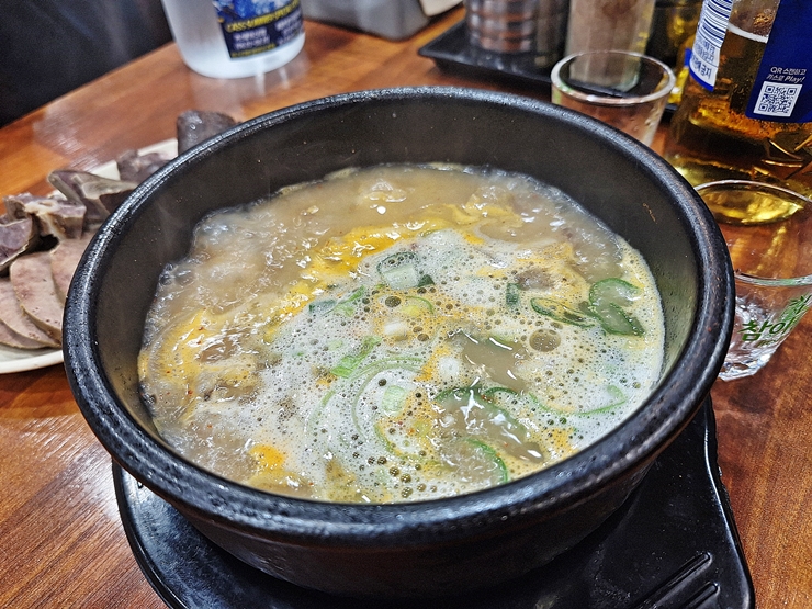 순대는 비록 당면 순대가 들어가지만 무료로 제공되는 것에 불만은 전혀 없다. 국물도 의외로 깊고 진한 맛이 나며 내장, 머리 고기가 많이 들어 있다. 이 순댓국을 한 번 먹고 소주 한 잔 마시면 여기가 바로 천국이지.