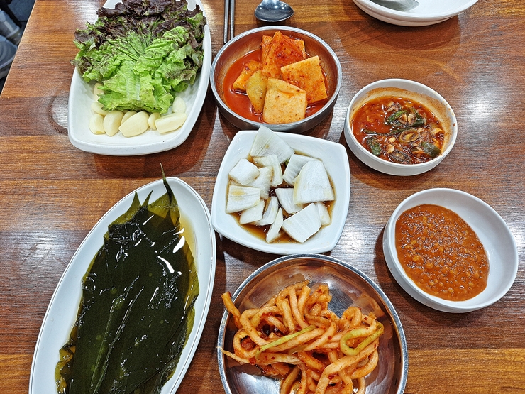 반찬, 족발 전문점에 가면 흔히 볼 수 있는 쌈 채소, 명이 나물과 무 생채 등이 나온다. 고기 반찬이 없어도 괜찮다. 우리는 고기를 먹으러 왔기 때문이다.