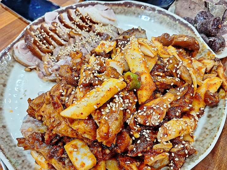 아름다운 모습의 매운 불족 반반. 불족의 경우 떡, 양파와 파 등을 함께 넣어 매운 소스에 볶은 것이다. 그래서 그 양이 상당히 많아 보인다. 이제 족발이 나왔으니 소주 한 잔 마시고 맛을 봐야지.