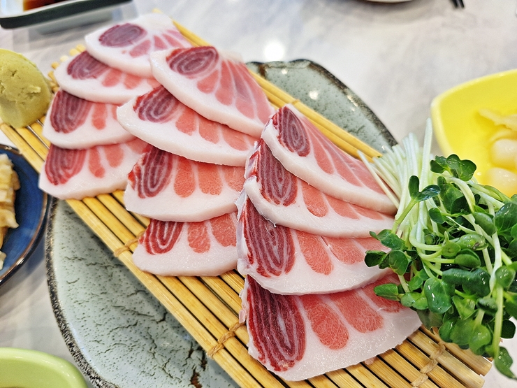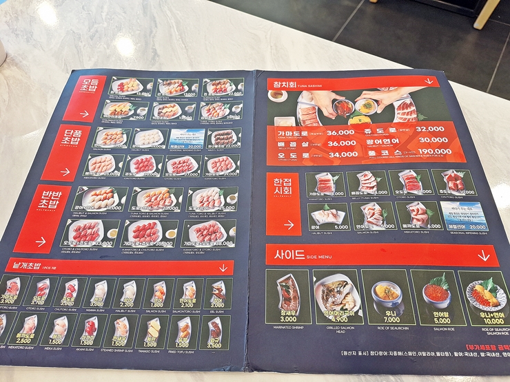 메뉴. 모둠, 단품, 반반 초밥을 판매하고 있고, 가마도로, 주도로, 배꼽살과 오도로 등도 판매한다. 우리는 이미 배가 좀 부른 상태였기 때문에 진 초밥과 배꼽살을 주문했다. 참치는 기름진 생선이기 때문에 많이 먹지 못하는 치명적인 단점이 존재한다.