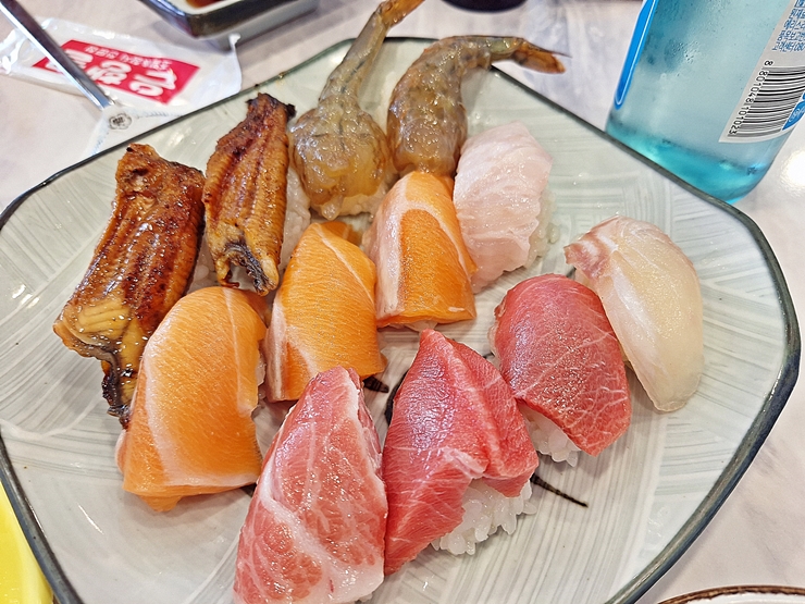 진초밥. 장어, 새우장, 연어, 광어와 참치의 조합이다. 참으로 아름다운 조합이 아닐 수 없다. 22,000원이라는 가격에 이 정도 구성이라니. 정말 훌륭하다는 말 밖에 나오지 않는다. 은행골의 초밥은 샤리가 굉장히 부드러운데 젓가락질을 잘 하지 못하는 사람이라면 숟가락을 사용해서 먹는 것을 권장한다. 난 젓가락질을 잘 못하기 때문에 숟가락을 사용해서 먹었다. 초밥을 입에 넣으면 굉장히 부드럽게 잘 풀리면서 조화를 잘 이룬다.