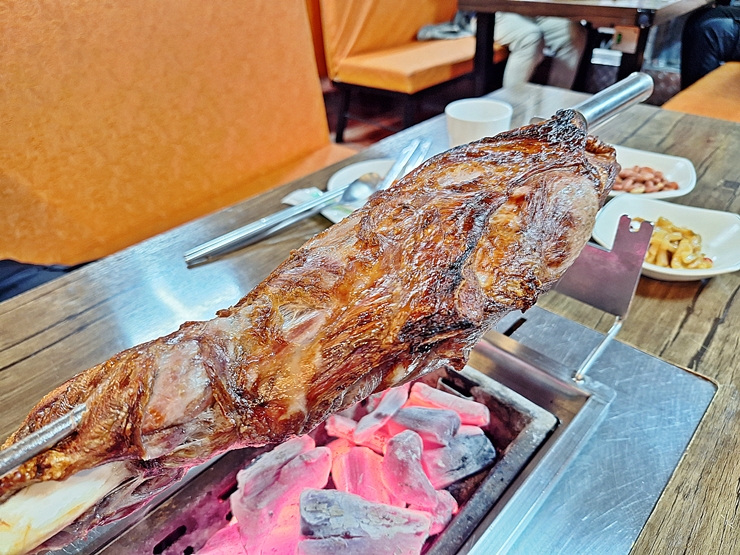 아기다리 고기다리 던 양다리 구이. 양다리를 통으로 굽기 때문에 최소 2시간 전에 예약을 해야 한다. 이런 압도적인 비주얼을 보면 양꼬치나 양갈비는 굉장히 사소하게 보이기 마련이다.