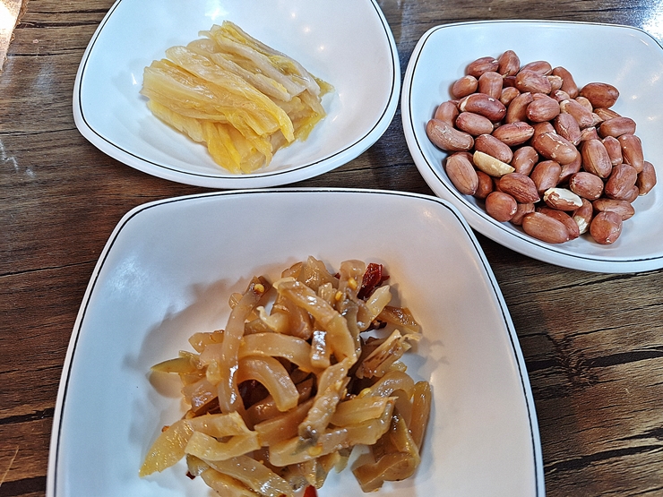 기본 반찬. 백김치, 땅콩과 짜사이가 나온다. 양꼬치를 판매하는 곳에서 흔히 볼 수 있는 반찬이다. 땅콩은 볶은 땅콩이 아니라 그냥 땅콩이 나오는데 술 한 잔 하기 적당한 안주다.