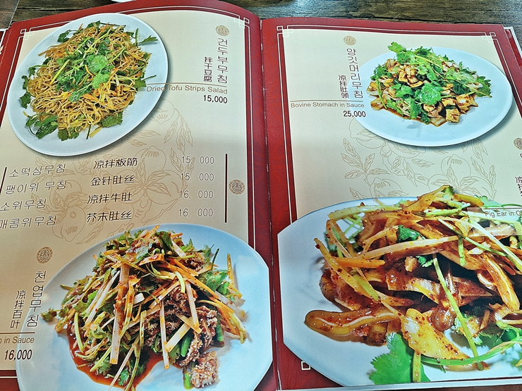 메뉴. 양꼬치, 양다리 등을 판매하고 있고 그 밖에 건두부무침, 천엽무침, 양깃머리무침, 만두와 볶음밥 등도 판매한다. 메뉴판을 여러 장 찍기 귀찮아서 그냥 한 장만 사진을 찍었다.