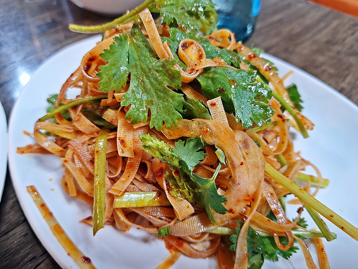건두부 무침. 건두부, 양파와 고수를 넣어 무친 것이다. 고수 때문에 호불호가 갈릴 수 있지만 고수를 제외해 달라고 하면 고수 없이 먹을 수 있다. 나를 포함한 일행들은 고수를 잘 먹기 때문에 빼지 않고 먹었다.
