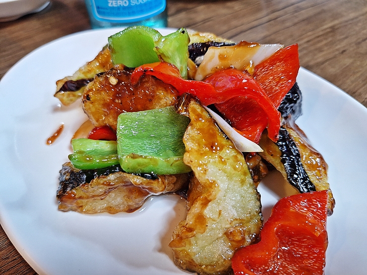 가지 튀김. 가지, 피망과 양파를 튀긴 후 소스를 입혀 볶은 것이다. 여기에 감자와 전분 가루를 푼 소스를 넣어 볶으면 지삼선이 된다. 이날은 바삭한 튀김을 먹고 싶었기 때문에 튀김으로 주문했다. 겉은 바삭하고 속은 부드럽게 잘 튀겼다.