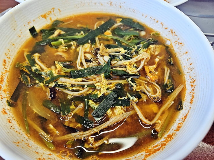 섭국. 홍합이 들어가서 맑게 나올 거라 생각했는데 얼큰하게 나온다. 이렇게 허를 찔리면 참으로 기분이 좋지. 홍합, 부추와 팽이 버섯 등이 풍부하게 들어 있다.