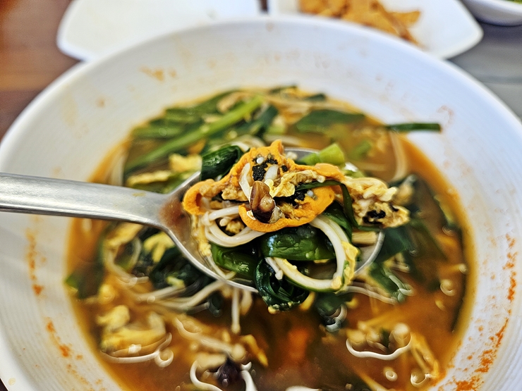 사진으로는 잘 표현이 되지 않았지만 큼직한 홍합이 섭섭하지 않게 들어 있다. 부추와 팽이 버섯 등이 홍합의 맛과 식감을 해치지 않고 잘 조화를 이룬다. 얼큰하게 끓인 섭국을 한 모금 마시면 저절로 해장이 되는 것 같은 기분이 든다. 국물 한 방울까지 남기지 않고 전부 해치운 후 다음 일정을 향해 발걸음을 옮겼다. 강릉에서 맛있는 섭국을 먹고 싶다면 가볼 것을 추천하는 곳이다.