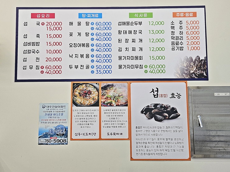 메뉴. 섭 전문점이라는 이름이 무색하지 않게 많은 섭 요리가 있다. 섭은 홍합을 뜻하는 말인데 홍합은 비타민 A, B, 칼슘, 인, 철분과 단백질이 풍부하다고 한다. 맛도 좋아서 그냥 끓여 먹어도 부족함이 없는 소중한 식재료다. 우리는 해장을 하기 위해 섭국을 주문했다.