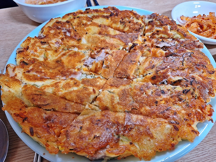 고기 빈대떡. 사진으로는 표현이 잘 되지 않았지만 두께가 상당하다. 고기는 돼지고기가 들어가는데 고기를 아낌 없이 넣었다는 것을 바로 느낄 수 있다.