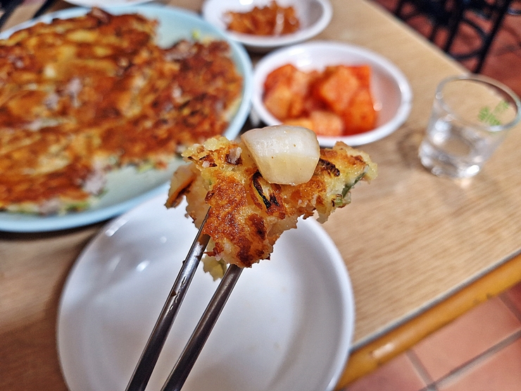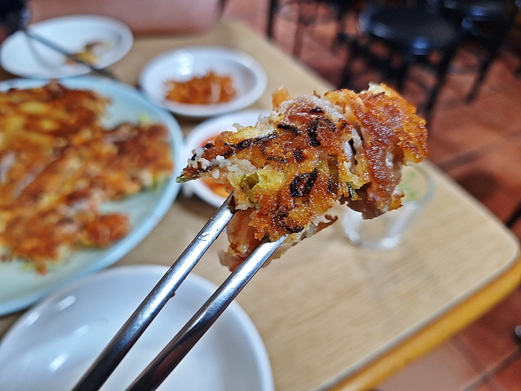 아무 양념 없이 빈대떡을 맛있게 냠냠. 고소한 맛과 돼지 기름의 진한 맛이 조화롭게 잘 느껴진다. 겉은 바삭하고 속은 부드러워 다양한 식감도 느낄 수 있다.