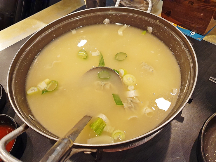 떡만둣국. 소량의 만두와 떡이 들어간 것이다. 간을 거의 하지 않아 슴슴한 것이 특징이다. 없어도 되는 것이지만 술을 마실 때 국물 요리가 필요한 사람에게는 참으로 반가운 것이 아닐 수 없다. 이 떡만둣국은 무료로는 리필이 되지 않고 추가 요금을 내야 리필이 가능하다.