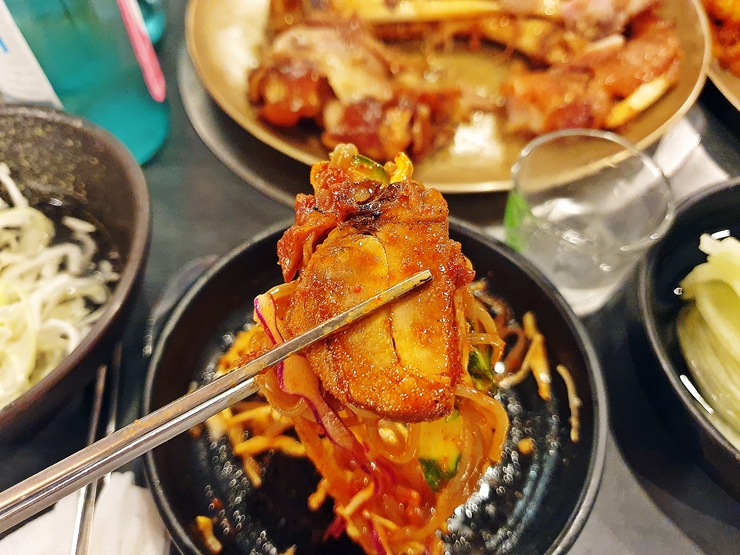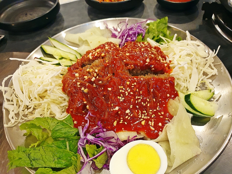 쟁반국수. 쟁반국수는 뭐 흔하게 볼 수 있는 비주얼과 맛을 보이고 있다. 막국수가 아닌 이런 쟁반국수는 전국적으로 맛이 거의 동일하기 때문에 먹지 않아도 되는 그런 요리다. 단품으로 주문한 것은 아니고 세트를 주문했기 때문에 함께 나온 것이다. 탄수화물 섭취를 줄이고 단백질을 많이 먹으려는 사람들은 세트를 주문하지 말고 단품 두 개를 주문해서 먹도록 하자.