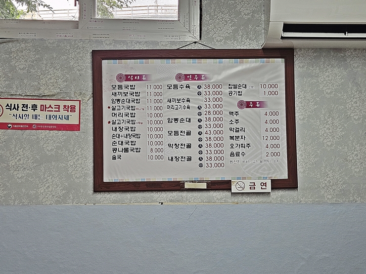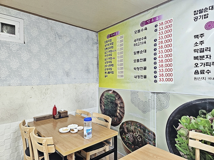 메뉴. 모둠, 새끼보, 암뽕 순대국밥과 더불어 다양한 국밥을 판매하고 있다. 그 밖에 안주로 모둠 수육, 암뽕 순대, 모둠 전골, 막창 전골과 내장 전골도 판매하고 있다. 이런 국밥에는 소주 한 잔 하면서 먹는 것이 정석이지만 오후에 미팅이 있었기 때문에 얌전히 밥만 먹기로 결정했다.