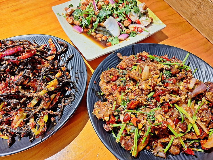 미꾸라지 무침. 건조한 미꾸라지를 오이, 양파, 마늘과 고추에 무친 것이다. 살짝 새콤한 양념으로 무쳤는데 미꾸라지가 건조 되어 그런지 미꾸라지 특유의 맛은 못 느꼈고 바삭하고 독특한 식감이 특색이었다.