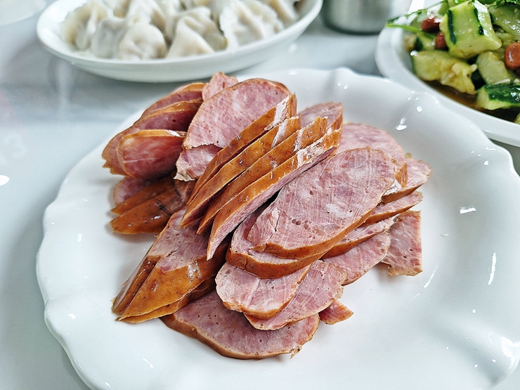우리가 주문한 것들이 전부 나온 사진을 먼저 올리기로 한다. 만두 4종류, 파이황과,수제 소시지와 고수 무침을 주문했다. 이제 보니 고수 무침은 사진에 빠졌네. 중국 소시지는 우리나라에서 먹는 것과 비교할 수 없을 정도로 참으로 맛이 좋다.