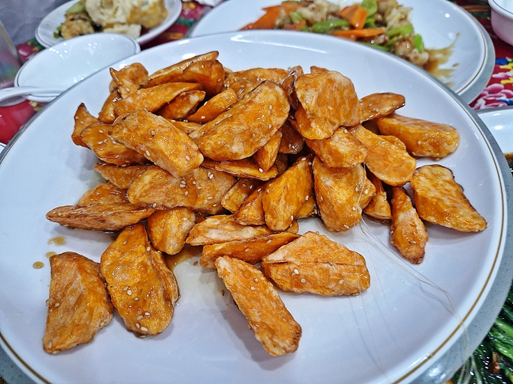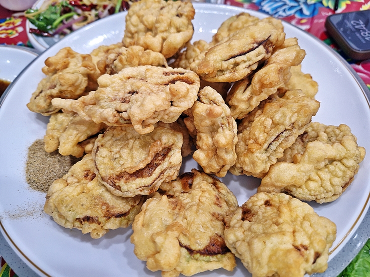 가지 튀김. 가지 안에 돼지고기를 넣은 후 튀긴 것이다. 돼지고기와 가지의 조합은 충분히 검증된 조합이기 때문에 맛이 없을 수가 없다. 유육단 소스에 찍어 먹어도 좋고 함께 나오는 후추 소금에 찍어 먹어도 좋다. 이우 강남4구에서 다양하고 맛있는 동북 요리를 즐기고 싶다면 한 번 가볼 것을 추천하는 곳이다.