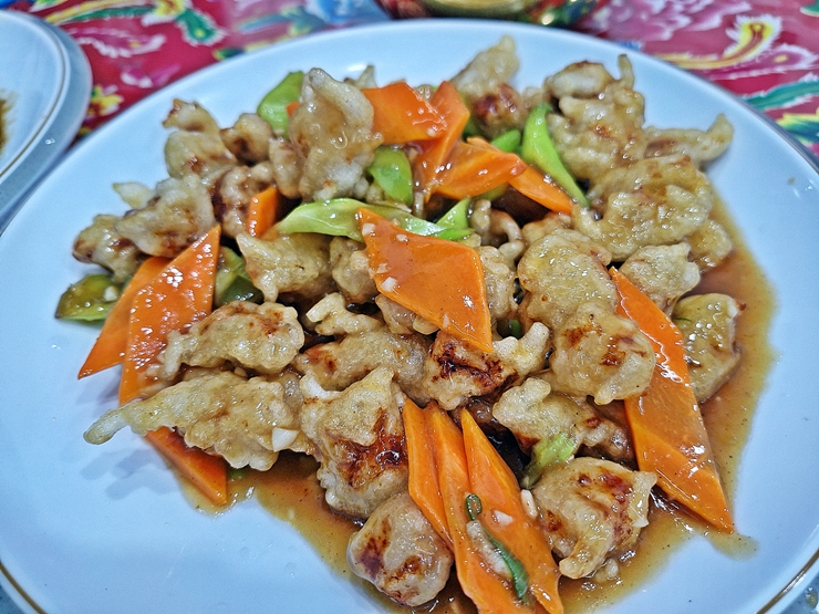 유육단. 유육단은 우리나라의 탕수육과 비슷한 음식인데, 소스 맛이 다르다. 탕수육이 새콤달콤한 소스를 사용했다면, 유육단은 짭짤한 소스를 사용한다. 그래서 술이 술술 들어간다. 겉은 바삭하고 속은 쫄깃하며 탱탱하게 잘 튀겼고 소스를 부었음에도 오랜 시간 바삭함을 유지했다.