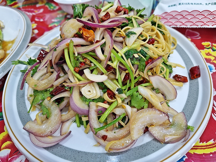 건두부 무침. 파이황과와 더불어 참 많이 먹은 음식이다. 동북 스타일의 건두부 무침은 고수, 양파와 더불어 통 후추와 고추가 잔뜩 들어간다. 그래서 다른 지역의 건두부 무침에 비해 맛이 강했다.