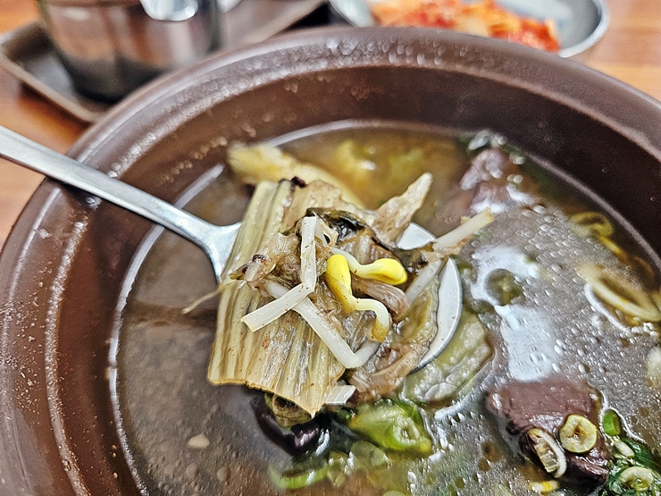 선지국밥에는 선지, 대파, 우거지와 콩나물이 들어있다. 5,000원이라는 저렴한 가격이라 선지가 대충 들어 있을 것 같았는데 들어간 양도 상당하다. 선지는 굉장히 부드럽고 잡내가 느껴지지 않는다. 국물은 된장 베이스로 만들었는데 구수한 맛과 시원한 맛이 함께 느껴졌다.