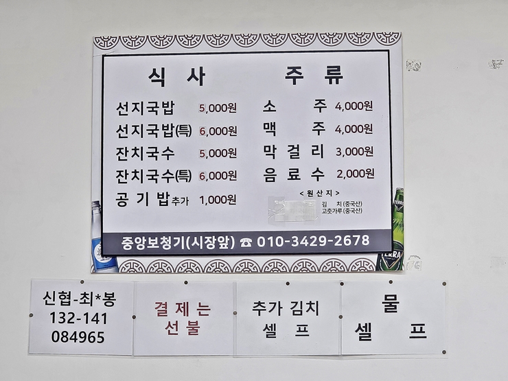 메뉴. 선지국밥과 잔치국밥이 있다. 둘 다 주문을 하면 빠르게 나올 수 있는 것들이다. 선지국밥을 5,000원이라는 가격에 먹을 수 있다는 것이 정말 놀라웠다. 포스와 가격은 마음에 들었으니 이제 맛만 있으면 된다.