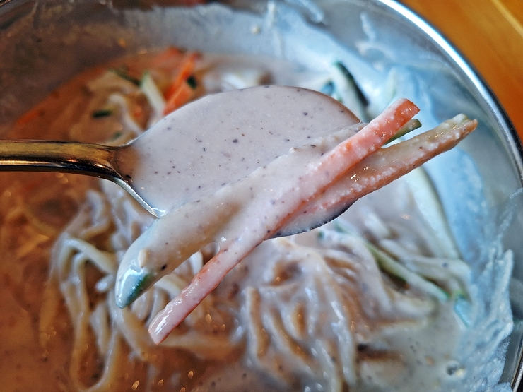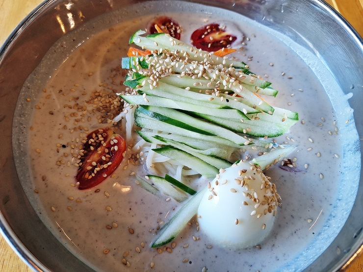 아름다운 모습의 콩국수. 방울 토마토와 당근이 들어있는 것이 좀 아쉽긴 하지만 콩국 색이 굉장히 진하다. 이런 진한 콩국은 참 맛있지.