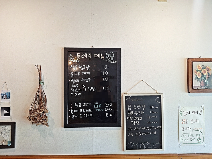 콩국수, 청국장, 순두부, 황태 해장국, 제육, 닭불고기, 오징어 덮밥, 된장찌개와 수제비를 판매하고 있고 예전에는 없었던 메뉴인 닭도리탕, 부추전과 감자전도 있다. 우리는 시원한 콩국수 두 개를 주문했지.