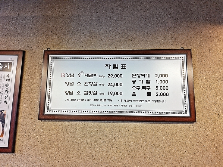 메뉴. 우대갈비, 안창살과 갈빗살을 판매하고 있고 사이드 메뉴로 된장찌개와 밥이 있다. 우리는 먼저 우대갈비를 즐기기로 했다. 우대갈비는 삼각지에 있는 몽탄에서 유행을 시켜서 이제는 전국적으로 흔히 먹을 수 있는 것이 되었다. 같은 우대갈비이지만 가게마다 비주얼 차이가 있다.