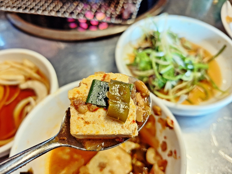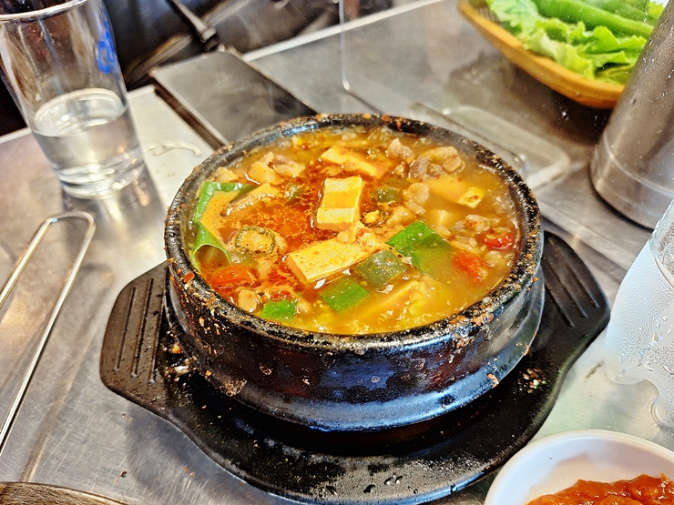 다진 고기가 굉장히 많이 들어 있고 두부, 파와 고추 같은 부속물도 많이 들어있다. 굉장히 진하고 깊은 맛이 나며 고기의 풍미도 느껴진다. 이런 된장찌개는 소주가 잘 어울리지.