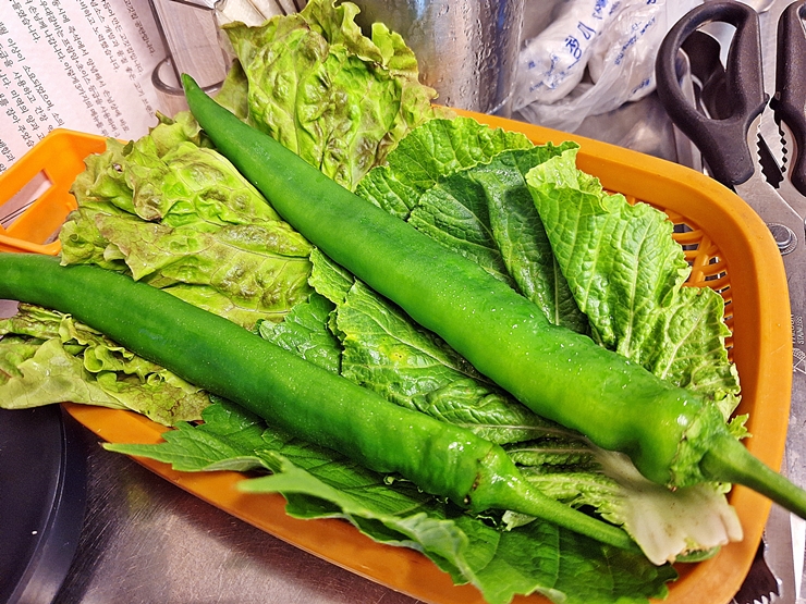 기본 반찬. 고객 수에 따라 겉절이, 미역국과 장아찌가 나오고 공통 반찬으로 고추와 쌈채소가 나온다. 미역국에 고기가 가득 들어 있어서 육향이 상당히 진하게 난다. 이런 미역국은 언제 어디서 누구와 먹어도 참 맛있지.