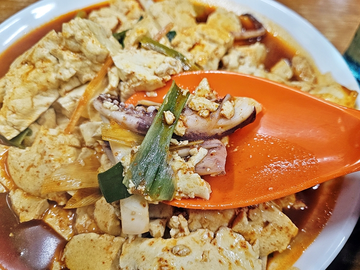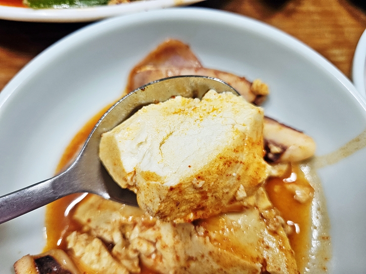양념이 잘 스며든 두부의 맛이 기가 막히다. 두부는 너무 딱딱하지 않고 무르지도 않다. 이 밸런스가 절묘하다. 적당한 부드러움과 함께 씹는 식감도 함께 느낄 수 있다. 중간 맛은 내 입에 살짝 맵고 칼칼했는데 기분 좋게 매운 맛이다. 이렇게 적당히 매운 음식은 소주와도 참 잘 어울려서 소주를 맛있게 마셨지.