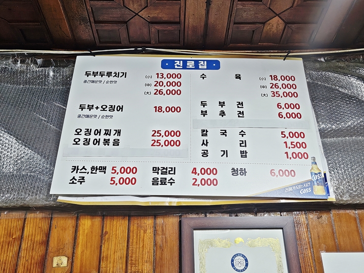 지난 번에 출장 왔을 때 두부 두루치기를 먹은 적이 있었는데 상당히 맛있게 먹었던 기억이 났다. 그래서 이번에도 두부 두루치기를 먹기로 했지. 두부 두루치기로 유명한 곳이 있다고 해서 찾아간 진로집. 인터넷을 좀 찾아보니 두부 두루치기로 가장 유명한 곳이라고 한다. 그렇게 기대를 하고 찾아가니 짧은 대기 줄이 있었다. 난 대기를 굉장히 싫어해서 그냥 다른 곳을 갈까 했는데 줄이 짧아서 그냥 기다리기로 했다. 그런데 몇 분 지나지 않아 바로 들어갈 수 있었다. 기다리기 잘 했구나. 역시 인내심이 뛰어난 나.