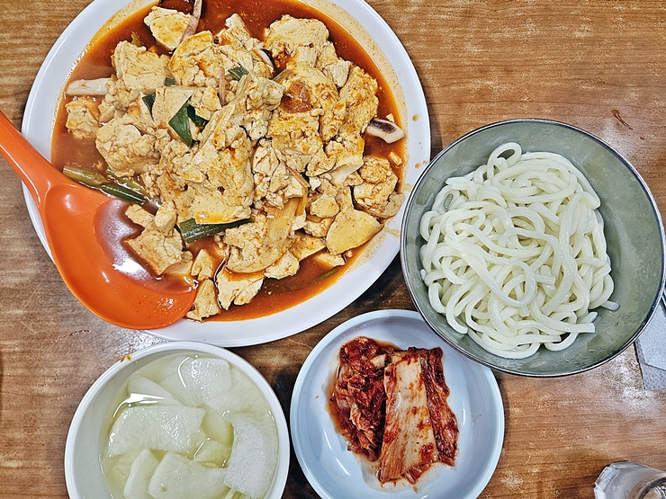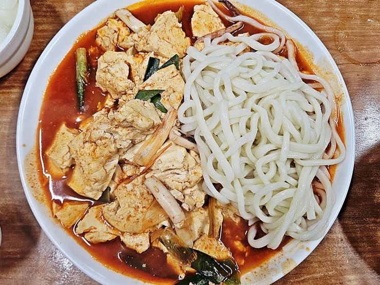 두부 오징어 두루치기. 두부도 단백질이니 항공 샷을 찍어야지. 양이 상당해서 두 명이 먹기에 충분하다. 중간 맛으로 주문을 했는데 코 끝에 살짝 찡한 매운 느낌이 들었다.