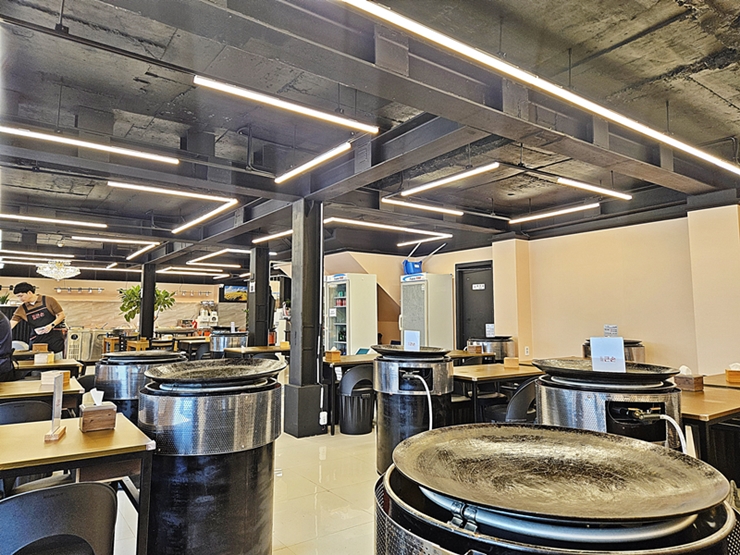 외근을 마치고 이른 시간에 방문을 했는데 매장이 넓고 쾌적하다. 테이블 옆에 큰 솥뚜껑이 있어서 자리에서 직접 꽃도리탕을 만들어서 먹는 시스템인 것 같다.
