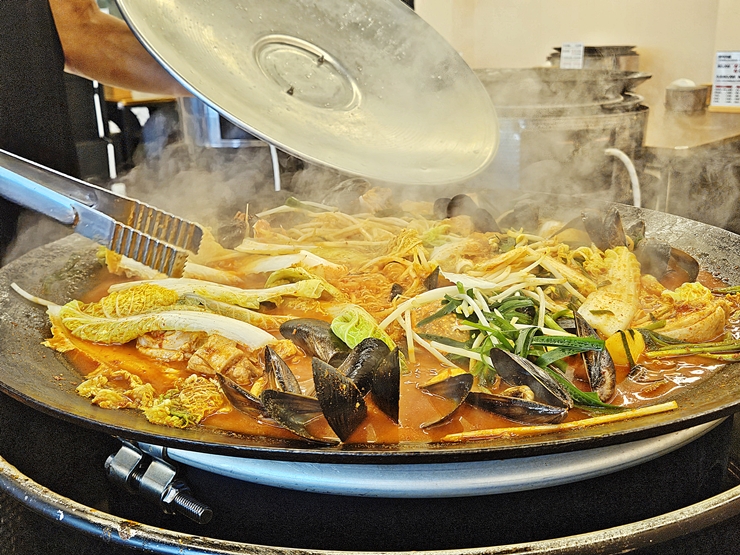 아름다운 모습의 꽃도리탕. 채소와 홍합이 풍부하게 들어 있어서 마치 큰 짬뽕과 같은 비주얼이다. 여기에 면만 넣으면 그대로 짬뽕이 되겠지. 그렇다면 이제 먹어 보도록 하자.