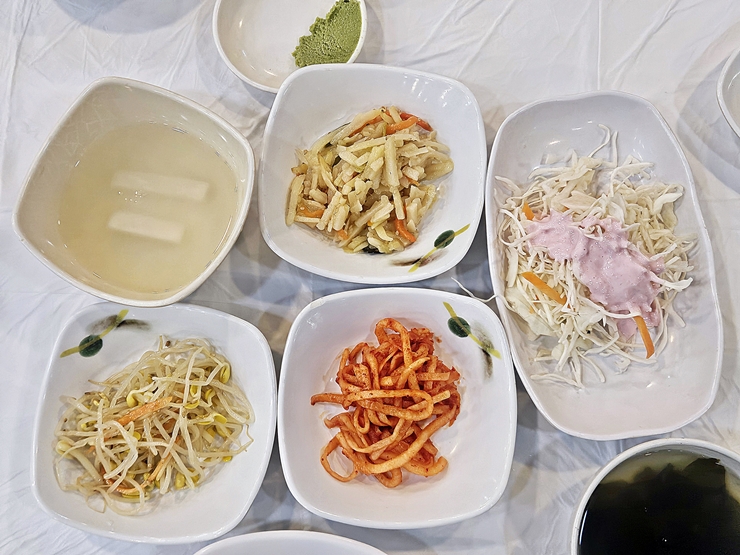 깔끔한 반찬. 동치미, 콩나물, 어묵볶음, 무생채, 샐러드와 미역국이 나온다. 고기 반찬이 없지만 괜찮다. 단백질은 주꾸미나 찜으로 충당하면 된다.